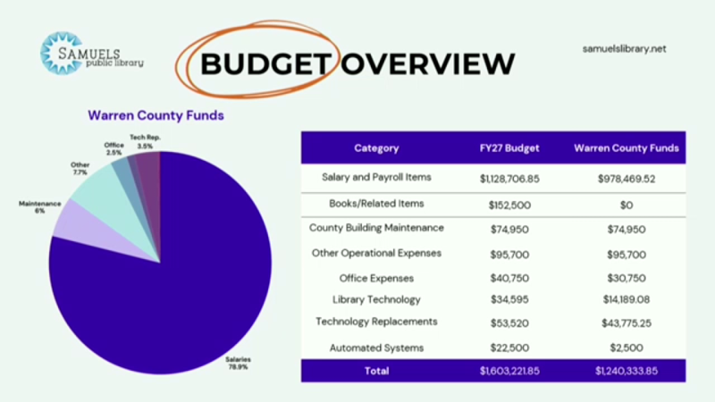 Samuels Library was the last of 12 outside agencies on the Warren County Board of Supervisors Work Session agenda of budget-requests on Tuesday, February 24th. However, the re-emergence of an annual funding request by Samuels for the coming Fiscal Year-2027, beginning on July 1, 2026, was probably the item of most public interest on the agenda in this budget season.