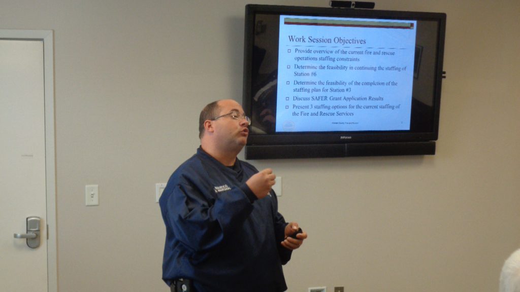 County Fire Marshal Gerry Maiatico begins power point presentation on the staffing situation and options for immediate and long-term solutions.