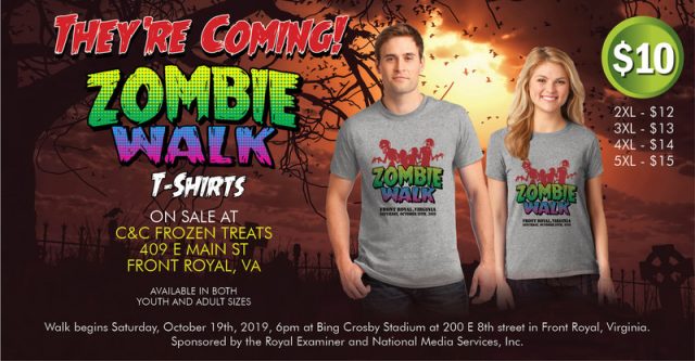 The 2019 Zombie Walk T-Shirts are on sale now. Go by C&C Frozen Treats and pick up your T-shirt today. Only $10. Proceeds will help support the Front Royal/Warren County Humane Society.