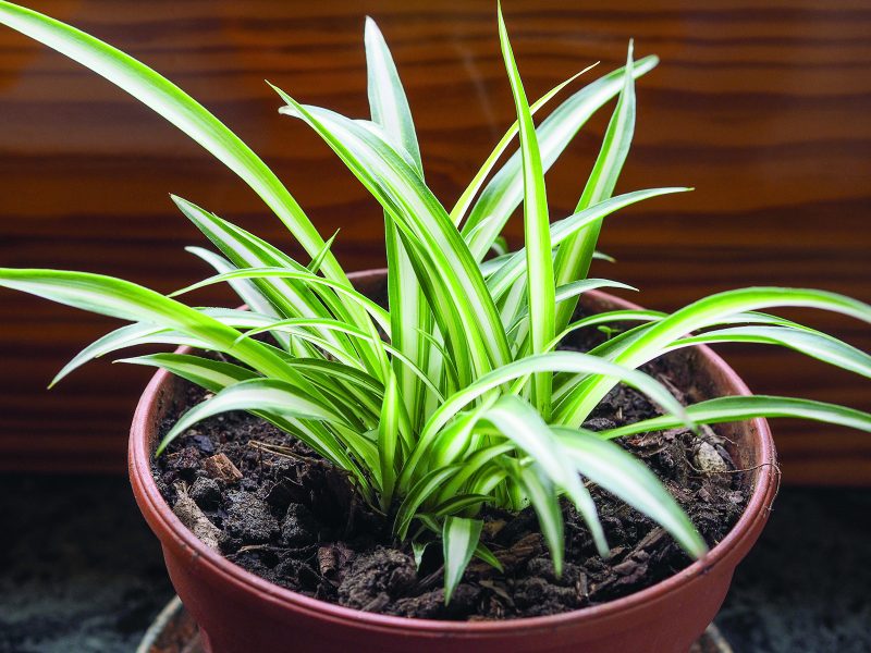 Usually called the spider plant, chlorophytum can be placed on a piece of furniture or shelf to trail down. It’s esthetically pleasing and easy to maintain. As a bonus, chlorophytum plants often produce pups, so you can create new plants to give to others.