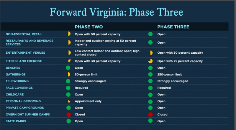 This week Governor Northam announced that on July 1, the Commonwealth will move into Phase Three of reopening. Previously, Virginia moved into Phase One on May 15 and Phase Two on June 12.
