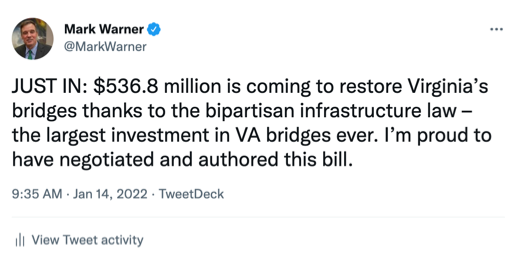 In July 2021, Sen. Warner visited the historic Mayo Bridge in Richmond, which could receive funds as part of the law. Images from that visit here.