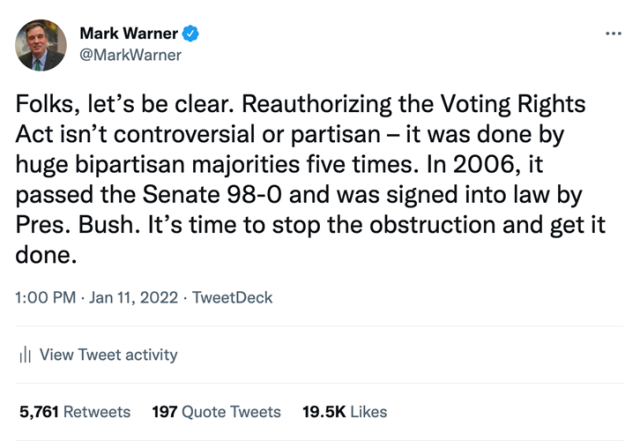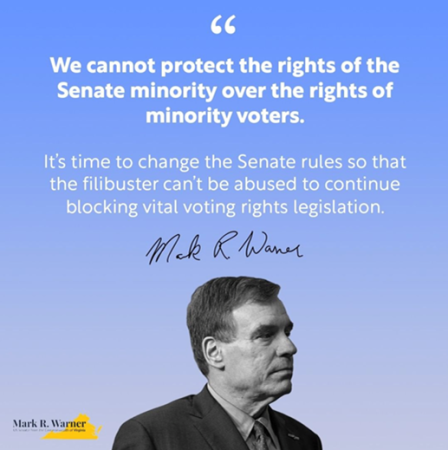 Sen. Warner has also continued to support the idea of a carve-out to the filibuster to get it done. Next week, he will vote in favor of this legislation as Sen. Schumer will likely bring it to the floor. In Sen. Warner’s words,