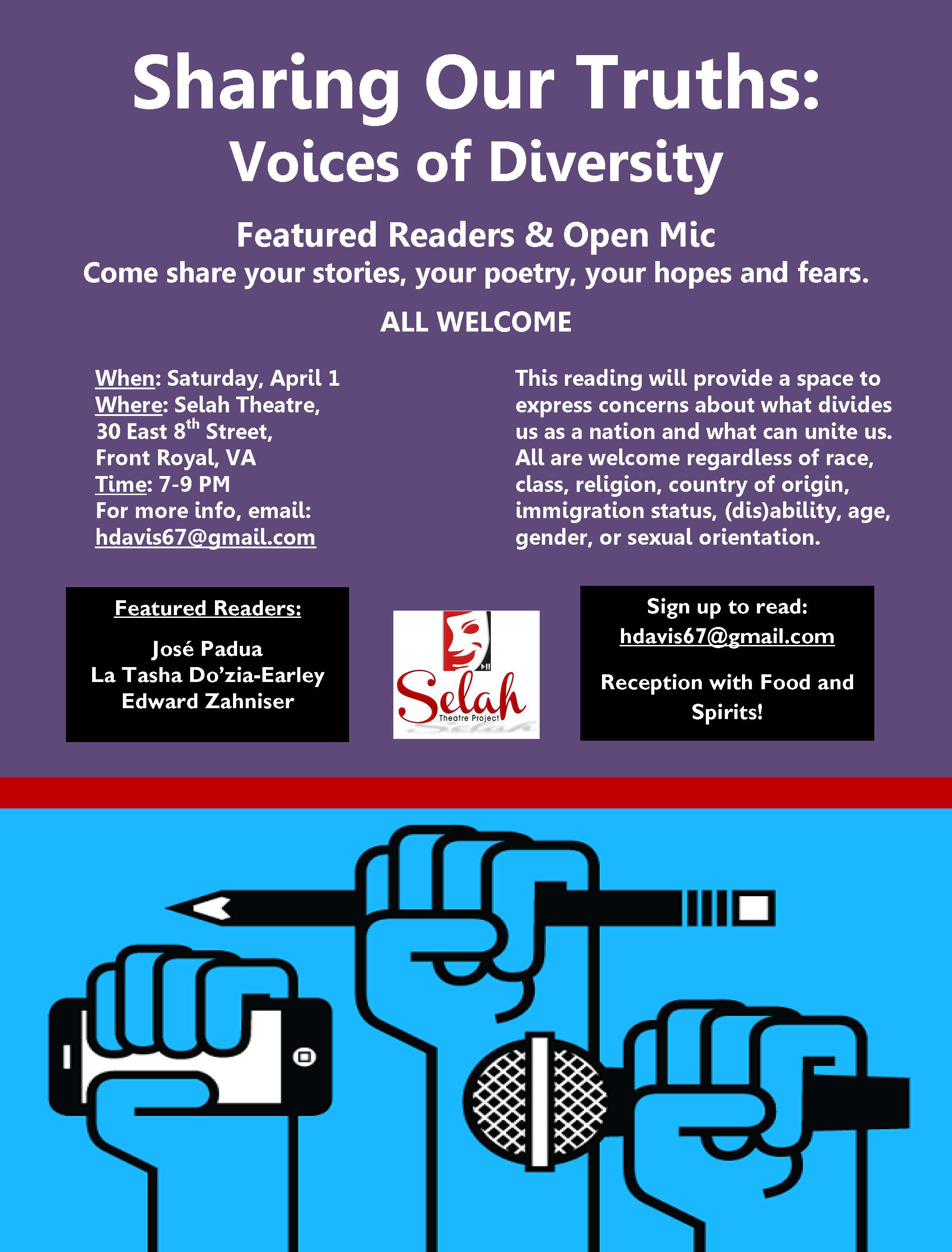 Front Royal, VA — To celebrate National Poetry Month, Selah Theatre will host Sharing Our Truths: Voices of Diversity, an evening of poetry and stories on Saturday, April 1 at 7:00 PM.