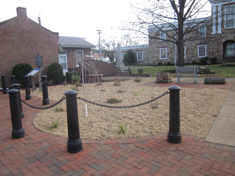 A shot of the evolving Memorial Garden on the Courthouse grounds, with the two relocated monuments flanking the newly installed bench. As noted above, the Constitution Oak plaque to the right will be replaced in the monument base with a salute to the county’s Revolutionary warriors laid to rest in Warren County.