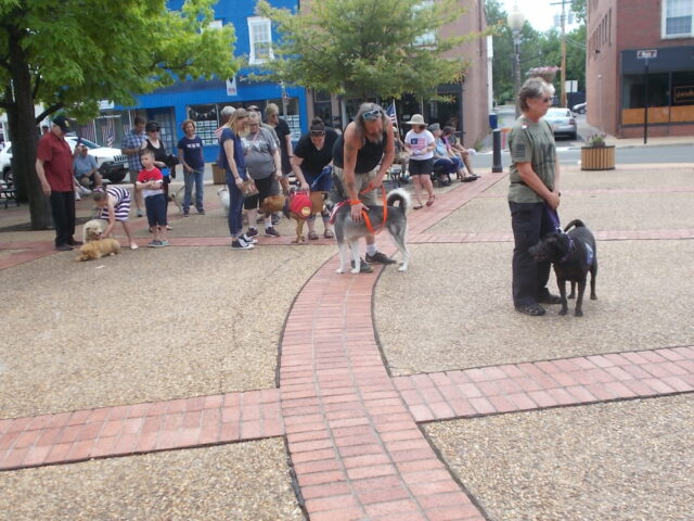 Led by retired USAF Master Sgt. Diana Lieber and her therapy Dog Bentley, other dogs and their owners muster for the Memorial Day blessing of the pets and pet parade. Royal Examiner Photos/Roger Bianchini