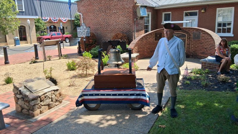 Barry Schwoerer, President of the Sergeant Major John Champe Chapter of the Virginia Society Sons of the American Revolution, strikes the bell as each grievance from the Declaration of Independence is read aloud, marking each one with solemn reverence. Below, members of the SAR wait in quiet formation for their turn to bring the words of America’s founding document to life.