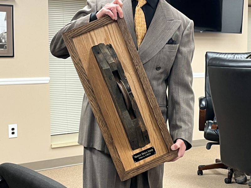 Above: Planning Director Lauren Kopishke presents Gary Duane “Dewey” Vaughan a piece of Front Royal history in recognition of his sixteen years of service on the Board of Architectural Review. Below: A close-up of a pulley from the old Murphy Opera House. Royal Examiner Photo Credits: Brenden McHugh
