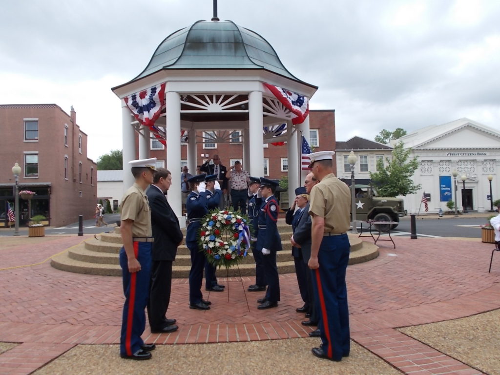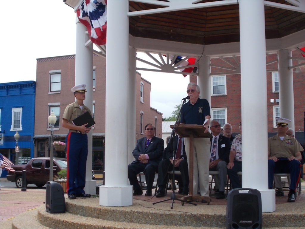 Lt. Col. Starling then recited the names and personal histories of some of the sons of Front Royal and Warren County whose lives have been lost to war: Edward Eugene Casarotti – “baseball in 1930’s; silk industry in town; landed at Utah Beach at Normandy (with this reporter’s father) – “Lost while clearing western France of German forces”. Larry Eugene Smedley – born Front Royal 1949; attended high school in Orlando, Florida and joined the Marines before graduation; led his six-man squad in Vietnam on a pre-emptive attack against a superior force raining U.S. troops with rockers, mortars and machine gun fire; died from wounds incurred on a successful attack on the machine-gun position. Charles William Davis – the Polk Avenue resident of Front Royal called “Bongo” by his football coach, joined and re-enlisted to serve in Vietnam. Lost in action on July 6, 1966, at age 25 during security patrols near DaNang in Quang Nam Province.