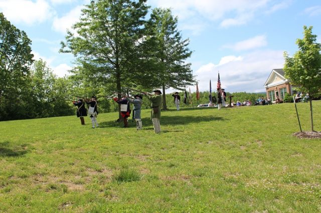 The ceremony began with the presentation of the colors. Reverend Jim Simmons led with an invocation, followed by the Pledge of Allegiance. After the colors were posted, Dale Corey gave a presentation on the history of Memorial Day and its significance. He was followed by presentations by Marc Robinson, Paul Christensen and Charles Jameson. There was a moment of silence and then a three round musket salute fired in honor of the fallen military from all wars.