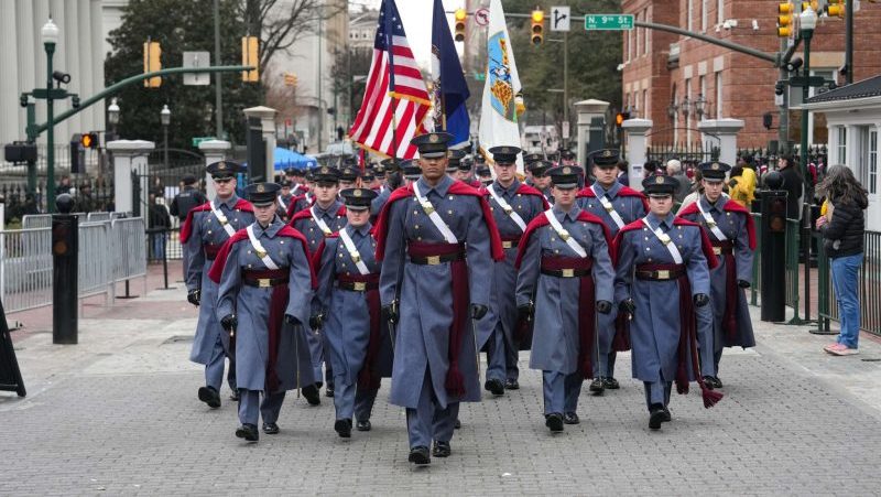 VMI cadets march in formation at Governor Spamberger’s inauguration, continuing a proud tradition of service and ceremonial excellence.