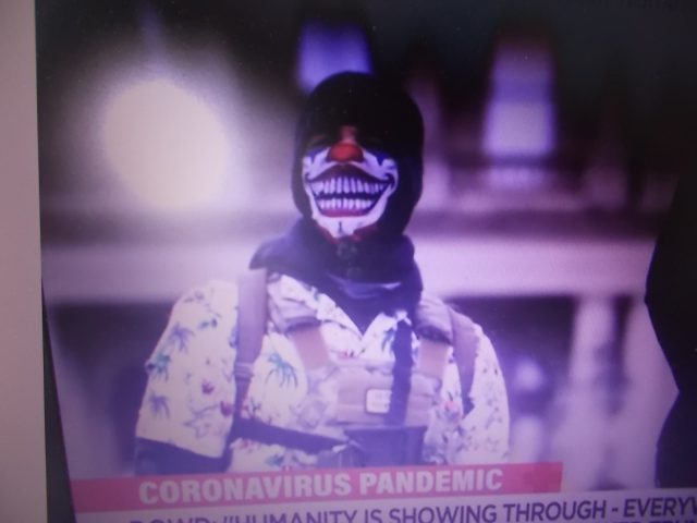 NOT that kind of mask – an armed ‘Re-open now’ advocate wears a clown mask in a seeming reference to a later ‘American Horror Story’ TV season. The photo was not taken here but from an NBC news report on the COVID-19 closing controversies around the nation.