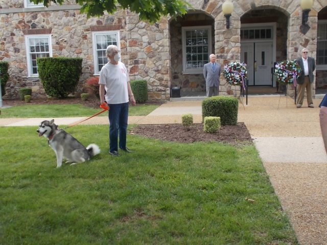While usually represented by many citizens’ dogs at the normally conducted ceremony at the Gazebo/Village Commons, due to the abbreviated pandemic nature of this year’s ceremony the Dogs of War were officially represented by Barr’s Husky Rescue dog Diva, alone.