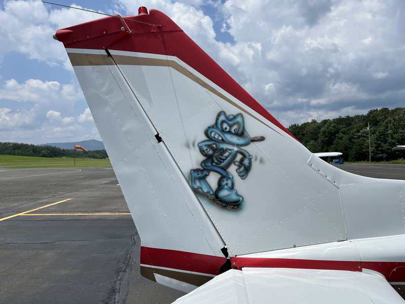 (Above) Bob O’Roark (L) and Kristian Stroemsvik (R), who are both part of the team at the Front Royal-Warren County Airport, stand in front of an airplane that bears the artwork of Navy Seal Peter Carolan. (Below) A close-up of the iconic frog that is Carolan’s signature. Royal Examiner Photo Credits: Brenden McHugh.