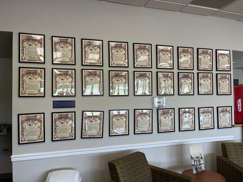A wall of honors. Having flown solo for the first time after training, new pilots receive a plaque commemorating their achievement.