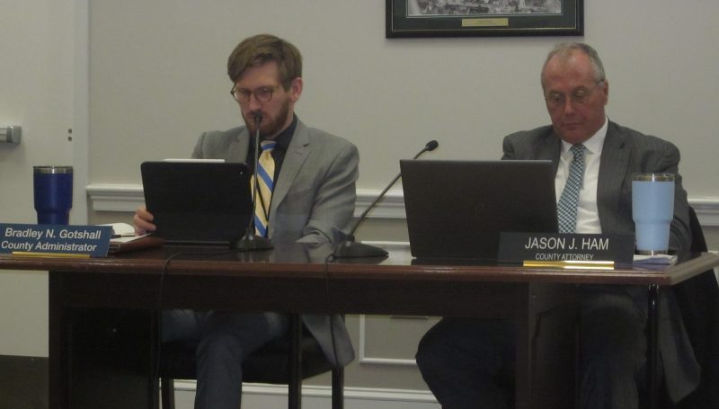 County Planner Kelly Wahl and Zoning Administrator Chase Lenz presented the staff overview of, not only the Zoning Text Amendment on roosters, but a number of other agenda items up for public hearing. Below, County Attorney Jason Ham, right, and County Administrator Bradley Gotshall, were available for background info on agenda matters. Ham was particularly quizzed on legal aspects of the path forward on revisting a vote on the Zoning Text Amendment allowing roosters to join chickens on residential properties over an acre in size.