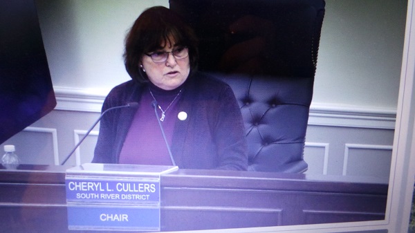 Board Chair Cullers looks for guidance from staff on whether to permit public speaker to continue personal attacks on members and others in a reworded ‘positive’ and ‘grateful’ manner. Below, filling in as interim county attorney for the meeting, Mark Bowman, to County Administrator Ed Daley’s left, suggested caution in cutting the speaker off early, but added that if the chair heard ‘one’ (personal attack) she was within her right to cut the speaker off. However, the speaker’s repeated use of the word ‘grateful’ for actions he either alleged without proof or doesn’t agree with, led the chair to allow him to finish this time around.