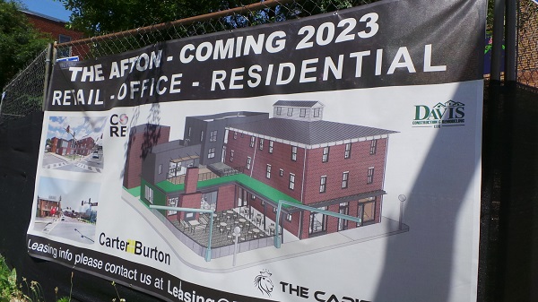 “I was invited by the owners of The Afton – the ‘Inn’ has been dropped going forward – to design artwork for the window openings while the building is under renovation. Instead of raw plywood, we agreed that it was an ideal opportunity to elevate the corner with public art and send a positive message to local residents that progress is happening inside the structure even if it’s not visible from the outside yet.”
