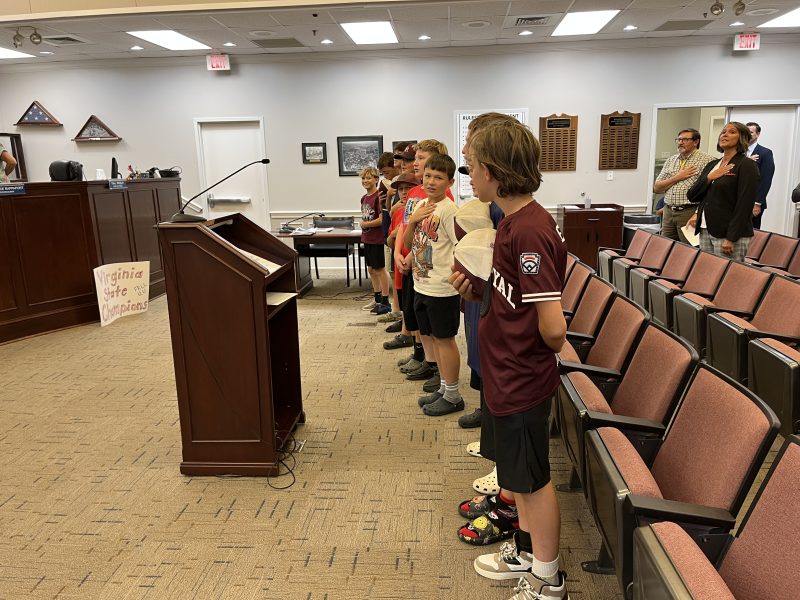 (Above) Front Royal Little League U-12 All Stars lead the gathering in the pledge of allegiance and (below) stand with Mayor Lori Cockrell, backed by council members, for the proclamation of their state championship and regional engagement.