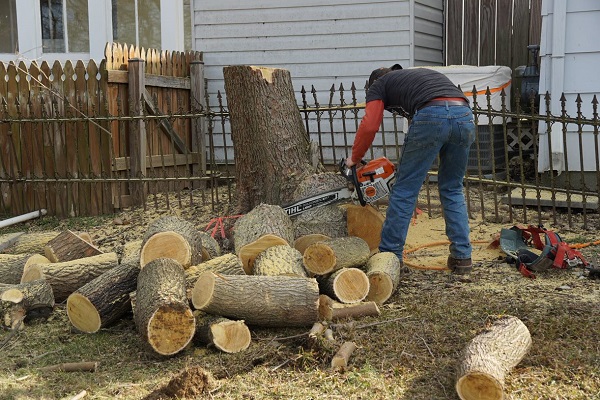 Shane Stine cuts up remainder of the tree trunk for hauling off to the county landfill. The 1882 Mast, Foos & Company Wrought Iron Punched Rail Fence in background.