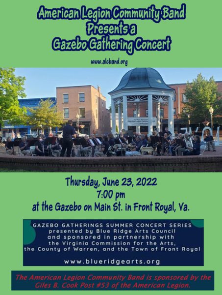 The American Legion Community Band will be performing on Thursday, June 23, 2022, at Gazebo Gathering Concert on Main Street, Front Royal at 7:00 pm. This is a free event, sponsored by the Blue Ridge Arts Council.