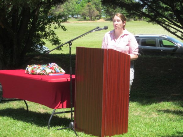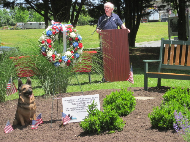Prior to the start of Saturday’s event, FRPD K-9 Marley shoved Dogs of War Memorial Garden German Shepherd statue ‘Ben’ into the ‘back row’ shadows as she prepared for her role in the day’s ceremony. Below, HSWC Executive Director Meghan Bowers kicks off the second annual Memorial Day weekend ceremony at the Julia Wagner Animal Shelter grounds. – Royal Examiner Still Photos Roger Bianchini, Video Mike McCool