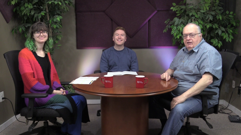Grace Green (left) and Ben Guerin (center) of Samuels Library join Mike McCool (right) in the Royal Examiner studio to share details about April programs and events.