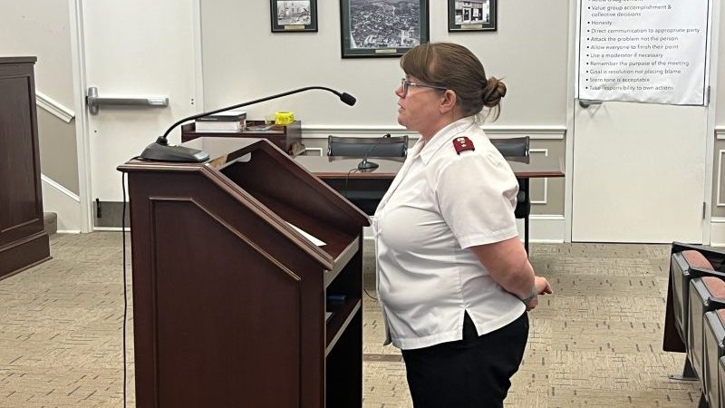 Captain Ann Hawk with the Salvation Army addresses the commission regarding the Salvation Army’s application for a special use permit to paint a mural exceeding sixty square feet on the exterior surface of the building at 296 South Street.