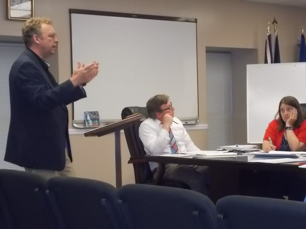 Jim Burton makes his case for a modern, multi-faceted structure that will retain four 150-year-old exterior walls, though the back one will be enclosed in the new design. Town Planning Director Jeremy Camp and BAR Chair Angela Toler, pictured, listen.