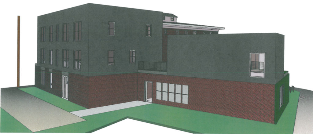 The view from behind Town Hall showing the new rear addition designed to house commercial use on the first floor and studio apartments on upper levels.