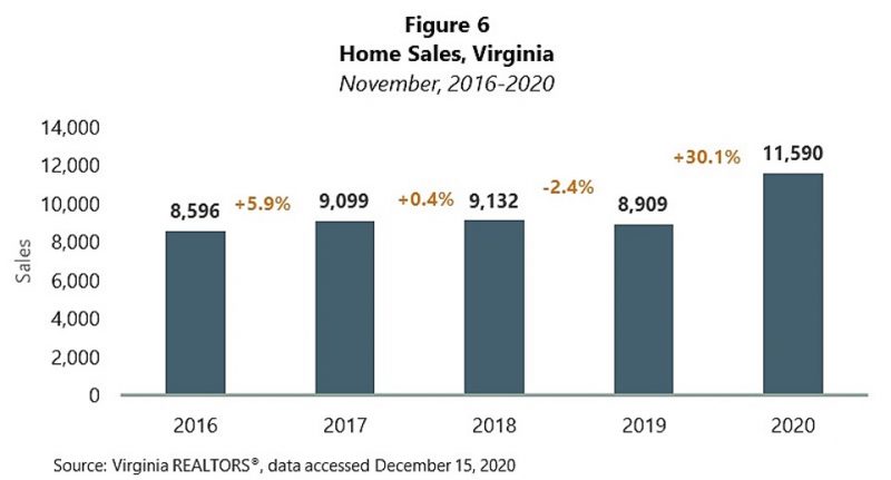According to the November 2020 Home Sales Report released by Virginia REALTORS®, for the second time this fall, home sales were up by over 30% in November, reflecting the greatest increase in home sales activity in more than six years.
