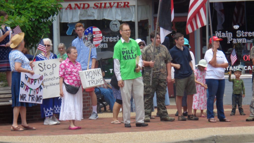 In fact, their first appearance with about eight people, including infants and children featuring anti-abortion and Virgin Mary signage, led to some confusion at the “Vigil” across the street. One vigil participant asked this reporter if there was an abortion clinic in or near the pawn shop that the new protesters were targeting. – “Nope,” I replied, “I think it is directed at you and the vigil” – a fact since verified more clearly by additional pro-Trump signage and an increasing focus on the vigil demonstrators directly across Chester Street. In fact, over the last two weeks a life-size cardboard cutout of President Trump has been added to the mix, which the pro-Trump contingent serenaded with “Happy Birthday” on June 14, Trump’s 71st birthday.