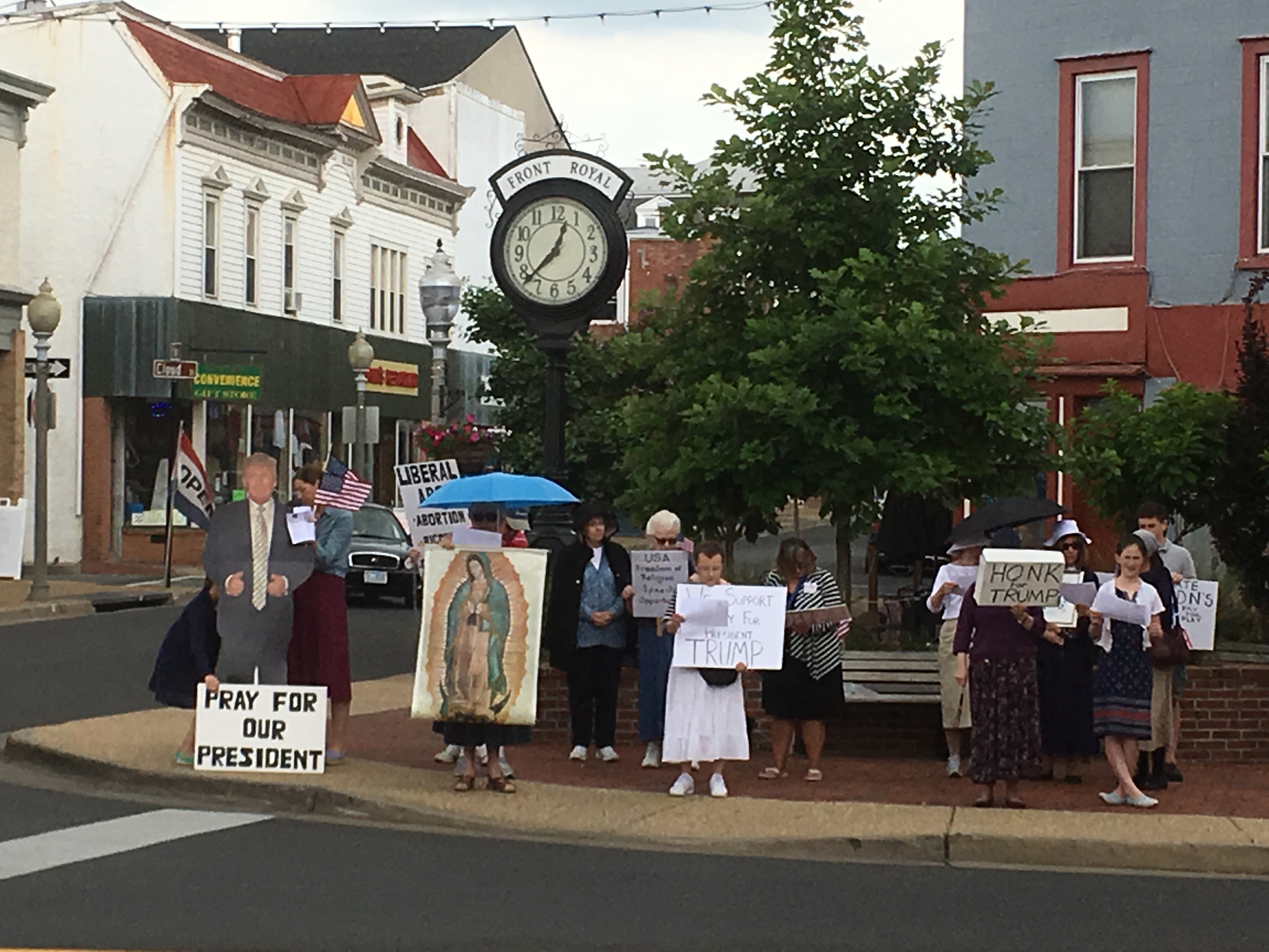 The pro-Trump Catholics have circled the sidewalk in front of the Wallers’ pawn shop, often behind an image of the virgin Mary praying “Hail Mary’s” and the Rosary aloud, while displaying signage ranging from anti-abortion and anti-birth control issues, to “Pray for our President” and somewhat dated attacks on Hillary Clinton, including “Benghazi” and murder-mystery conspiracy theories like “Hillary, who killed Seth Rich?”