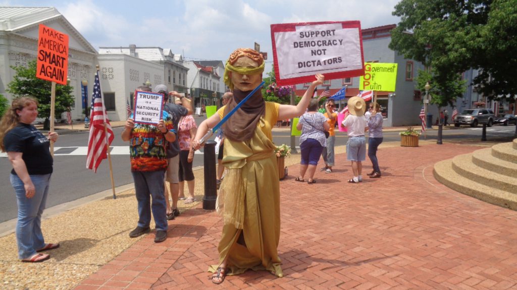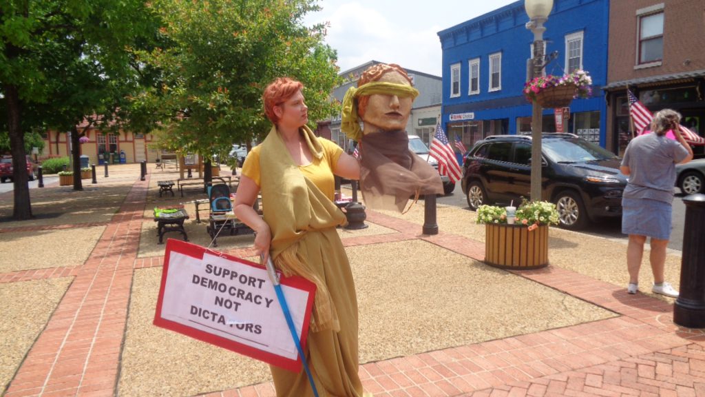 A member of a Rappahannock theater group dressed as “blind Justice” joined the Vigil for Democracy on June 14 – MAN, it must have been HOT in there – that’s better; can “Justice” see now?