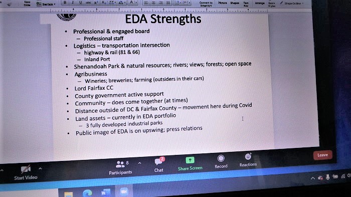 Two additional actions were bookkeeping items introduced in the report of the Finance Chair Jorie Martin. Both motions were unanimously approved: a/ to eliminate the EDA Rent account at Atlantic Union and transfer all monies to the EDA Cash-Operational account. b/ To recode specific payments made by the Northern Shenandoah Valley Regional Commission as Note Receivable payments, as they were previously recorded and deposited incorrectly to the EDA Rent account at Atlantic Union. These payments will be deposited in the EDA Cash/Operational account.