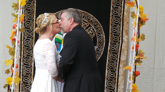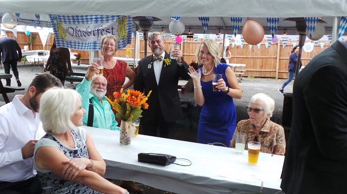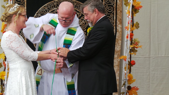 Once together in front of family and friends, Lay Anglican Vicar Michael Williams helped the couple tie the knot, literally, in the Celtic tradition, along with the exchange of rings. From there it was to the tent – NOT that one, the Biergarten food tents and main protection against any untoward elements tent where many a celebratory toast was raised to a match, if musically accompanied by “Hell’s Bells”, certainly made in heaven.