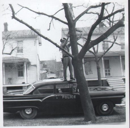 Officer Fred Cline (1960-64) standing on the roof of his police car attempting to reach up and take down a broken tree limb on Germain Street. Photo courtesy Patty Vann Snyder.