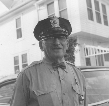 Officer Nathan Smallwood (1947-56, 1958-60) standing in front of the town patrol car. Photo courtesy Charles Pitcock.