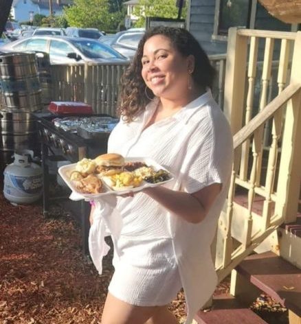 With DJ Yani, left pausing for the cause, and Bev’s brother Greg Williams, right, poised to give an opening invocation and blessing of the food, Bev officially launches his birthday party from the stage area of Va. Beer Museum Biergarten after about an hour-plus of practice partying by early arrivals. Below is a shot, courtesy of Bev, of a well-rounded food tray headed for a shady under-the-tent spot to be devoured. Royal Examiner Photos Roger Bianchini unless noted otherwise.