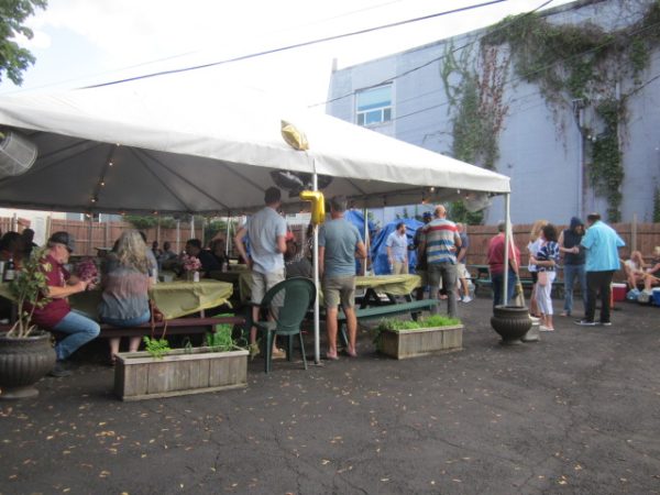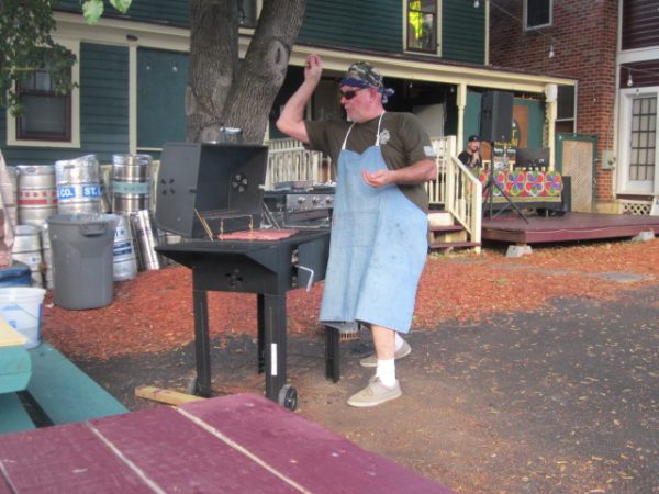 While the cloud cover against a late afternoon blazing summer sun was intermittent, the tent shade was consistent. Below, Bev and friends in the Beer Museum’s George Washington Room. George, far left, helped keep an eye on the food distribution line once stocked by grill-master Hank Gorecki, tossing a little salt a burger’s way outside.