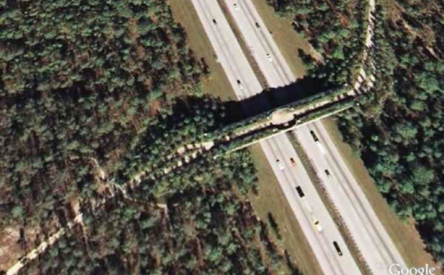 Wildlife crossings are becoming more common in highway expansion projects in North America. An example is the Greenway Landbridge on Interstate 75 in Marion County, Florida (Credit: Google Earth)