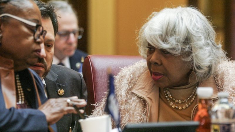 Virginia Sen. Louise Lucas, D-Portsmouth, talking with colleagues during the 2026 General Assembly session. (Photo by Shannon Heckt/Virginia Mercury)