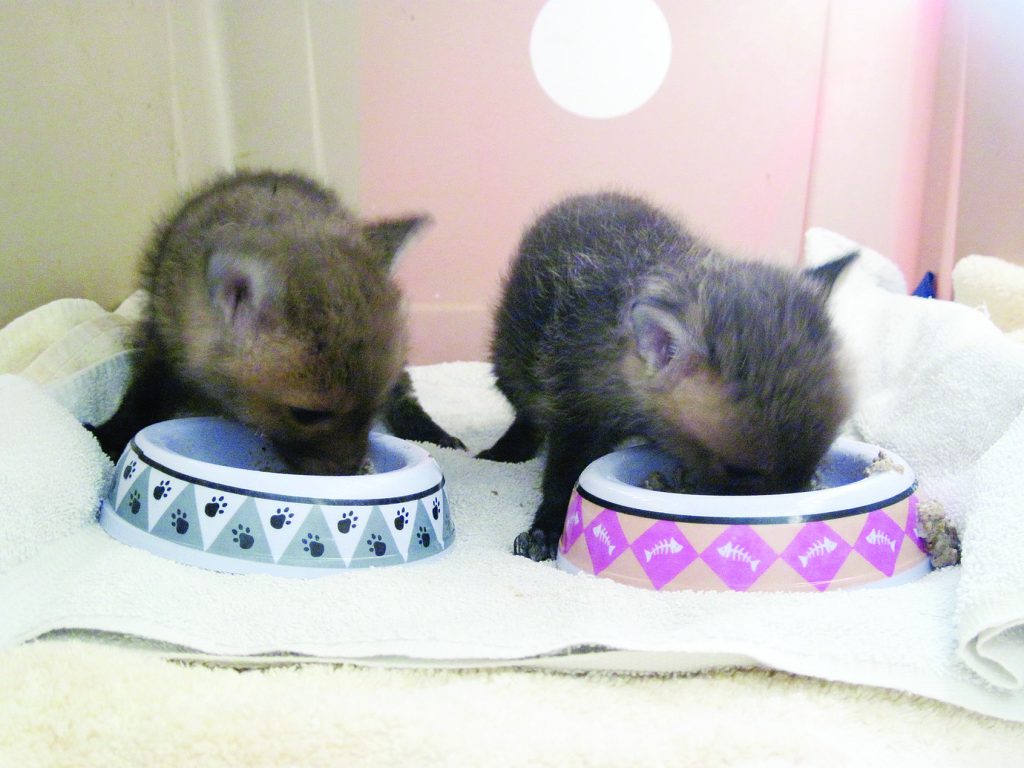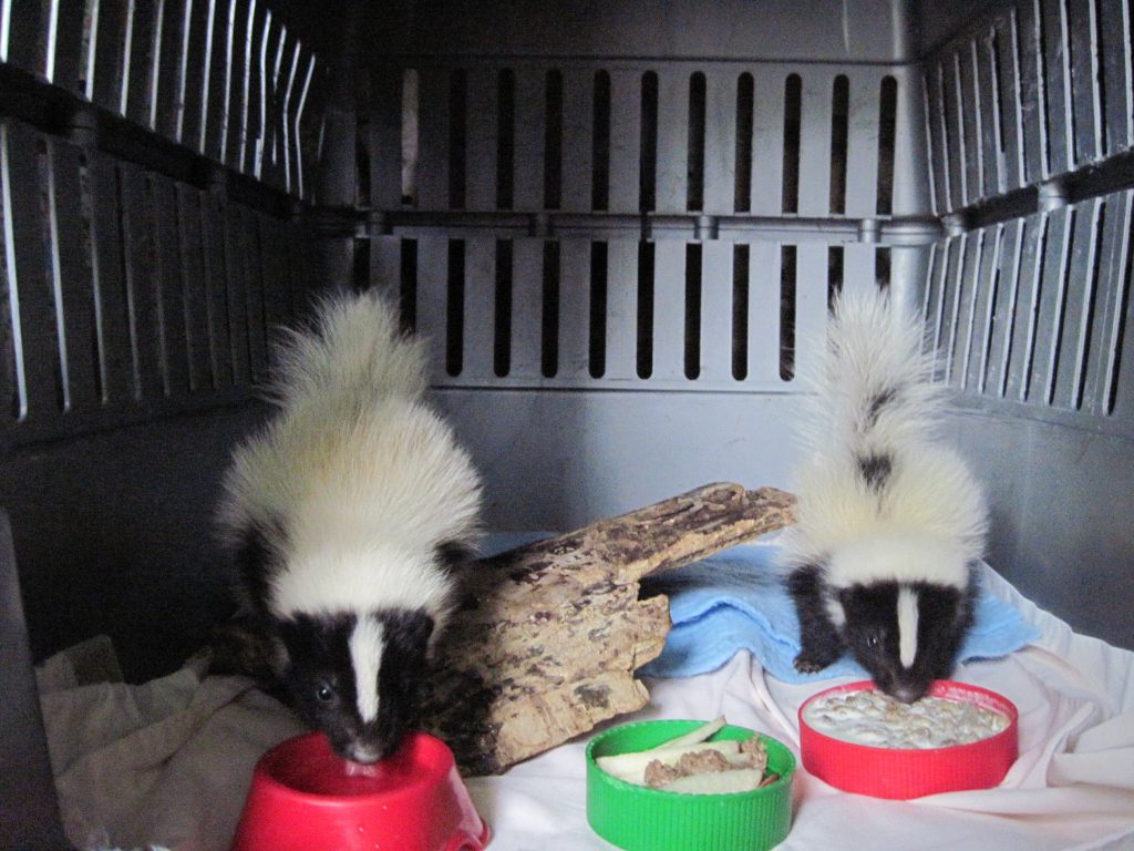 Above, baby squirrel feeding; below baby skunks doing the same.