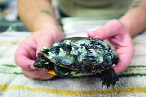 Dr. Jennifer Riley, DVM, with a resident screech owl of which the author observed, ‘We tried to out stare each other. – He won!’ Below, Dr. Jen’s handiwork – pulling a broken turtle shell back together