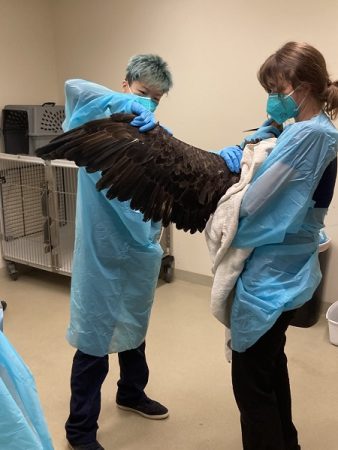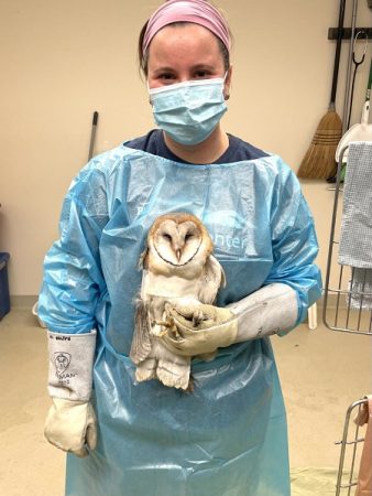 Pictured in succession are new Veterinary Doctor Emily Hsieh examining a eagle’s wing with some assistance; Rehabilitation Associate Sarah Midolo with owl; and Front Desk Coordinator Alysa Everly coordinating.