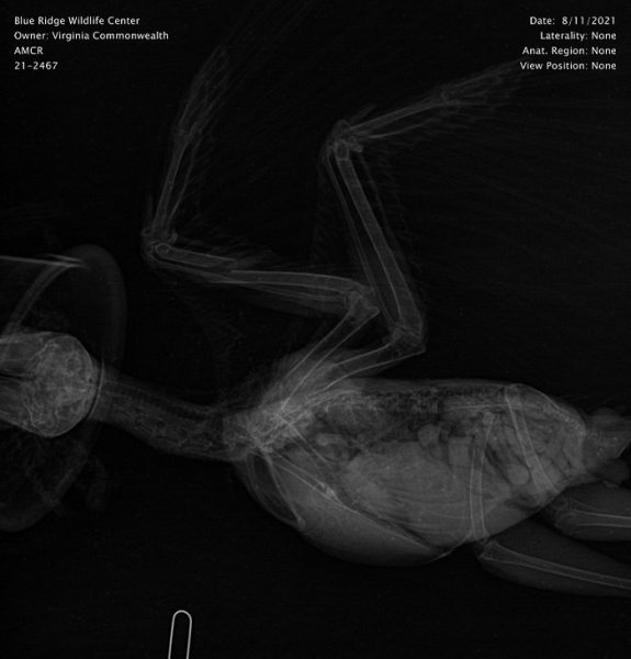 This radiograph shows the American Crow on the day of admission. The left ulna (the thicker bone on the wing that is closest to the head in this image) is fractured. Had the bone been well-aligned, a simple bandage would have been sufficient to stabilize the fracture and allow for healing. In this case, we felt that there would be better healing with surgical stabilization. Wild animals must be able to get around well, find food, and live without chronic pain. The bone simply healing together is rarely good enough. It needs to be fully functional. To give this bird the best chance of long-term survival, surgery was performed.