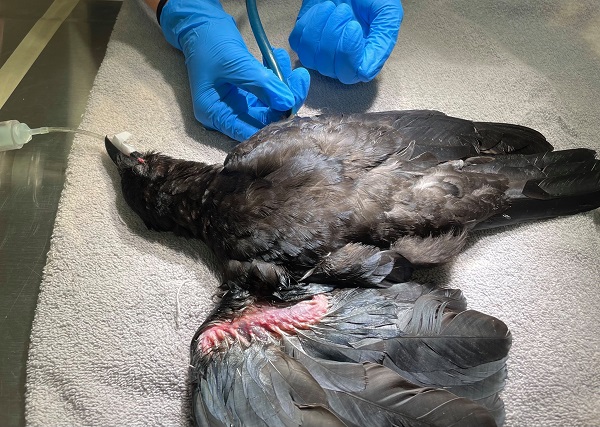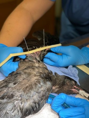 Prior to surgery, the wing was bandaged and the patient was given strong pain medications. Fluids were administered to rehydrate this bird and antibiotics were also started as metal would be placed in this bird’s bones. Once stable for surgery, the patient was placed under general anesthesia using an inhaled anesthetic and intubated so that we could have better control of the airway. In the above photo, the crow is being prepared for surgery and a veterinary student is getting a heart rate.