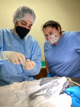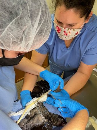 In the second photo, one of our veterinary students is holding and keeping the fracture stable while the acrylic material in our “fixator bar” hardens. Once hard, the external fixator will hold those bone segments in place.