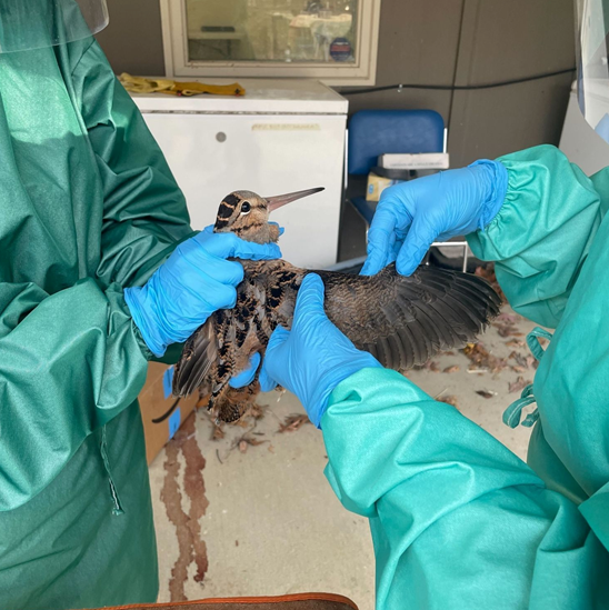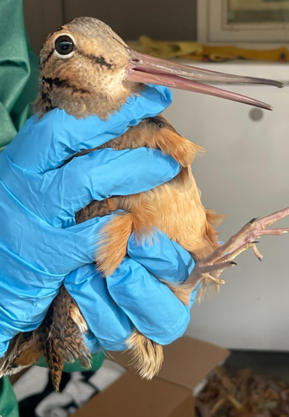 This species migrates at night, which makes them especially vulnerable to becoming disoriented by artificial lights. As a result, many of the woodcocks we admit arrive as window-strike victims.