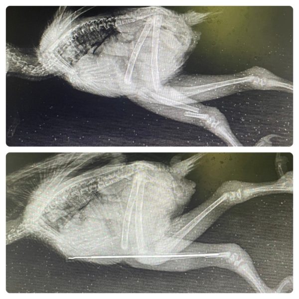 Given the age of this patient, we anticipate significant healing and pin removal in the next week. During this time, the owl will be treated with pain medications, antibiotics, hand feedings, and cage rest.